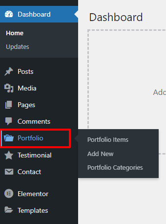 - Find ‘Portfolio’ in WP Admin Menu